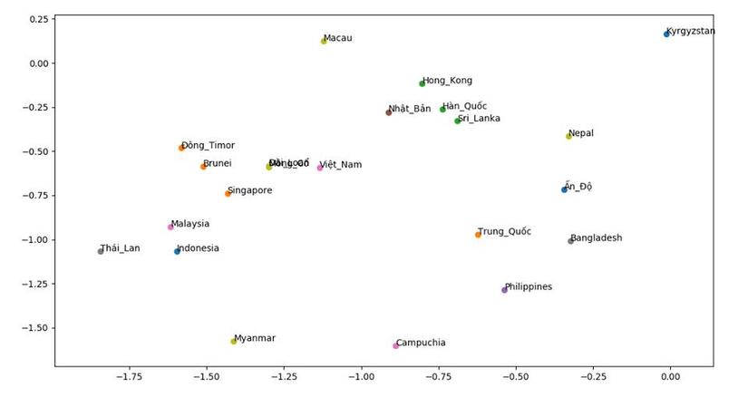 Sử dụng mô hình với một vài ví dụ vui Để có cái hình dung dễ hơn về sự tương đồng ngữ nghía giữa các từ, ở đây mình load lại 2 mô hình vừa train ở trên là visualize lên không gian 2 chiều. Các từ được visualize bao gồm: tôi, phụ nữ, đàn ông, em, con gái, con trai, thời gian, tiền bạc. ![]() Một project vui khác mà mình thực hiện, để khám phá độ tương đồng về văn hóa các quốc gia trên thế giới. Dữ liệu training bao gồm 350.000 bài báo quốc tế được thu thập từ vnexpress. Kết quả cho thấy sự tương đồng về văn hóa giữa các quốc gia cũng được phân cụm gần tương tự với vị trí địa lý. ![]() Ngoài ra, bạn cũng có thể tham khảo các phương thức dựng sẵn bở gemsim như tìm ra từ gần nghĩa với từ đầu vào nhất,...và rất nhiều hàm thú vị khác. from gensim.models import KeyedVectors model = KeyedVectors.load('../model/word2vec_skipgram.model') for word in model.most_similar(u"công_nghệ"): print word[0]