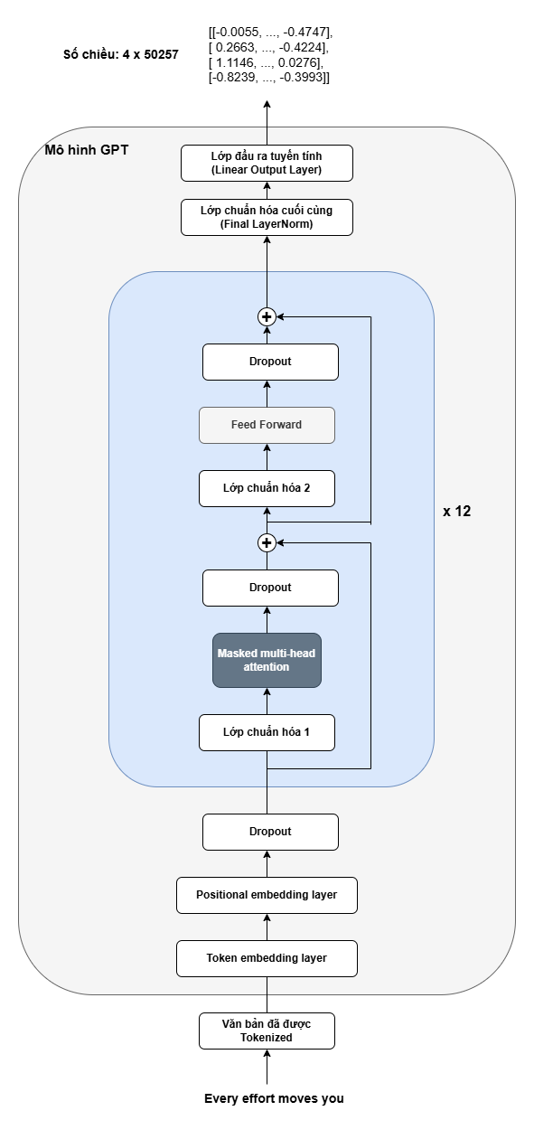 vocab_size: Số lượng từ vựng là50257context_length: Số lượng token tối đa mà mô hình có thể xử lý trong 1 lầnemb_dim: Số chiều vector inputs embeddingsn_heads: Số lượng head trong khi sử dụng cơ chế multi-head attentionn_layers: Số lượng decoderdrop_rate: Tỷ lệ dropout bao nhiêu %qkv_bias: Dạng boolean, mang ý nghĩa rằng có sử dụng tham số bias trong quá trình tính các ma trậnQ, K, Vhay không ?