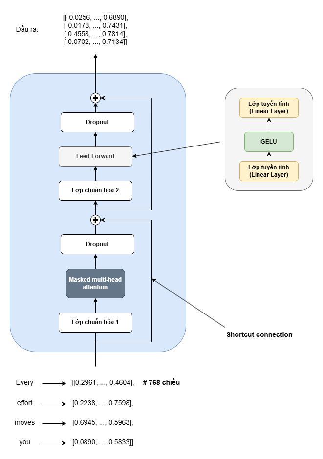 d_modelthànhd_ff(thườngd_ff = 4 × d_model) - Lớp tuyến tính thu hẹp (projection layer): Biến đổi vector từ kích thước