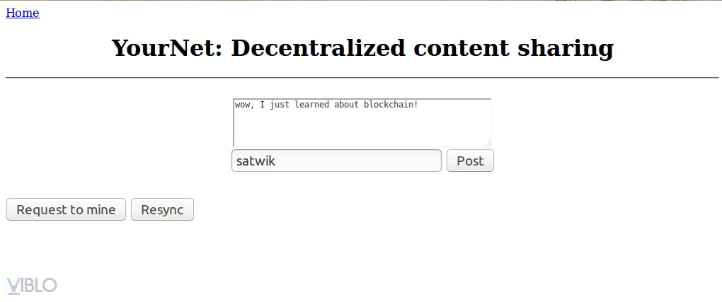 Ứng dụng có một biểu mẫu HTML để nhập đầu vào của người dùng và sau đó thực hiện request POST đến node được kết nối để thêm transaction vào nhóm transactions chưa được xác nhận. Transaction sau đó được mining bởi mạng và cuối cùng được tìm nạp sau khi reload trang: