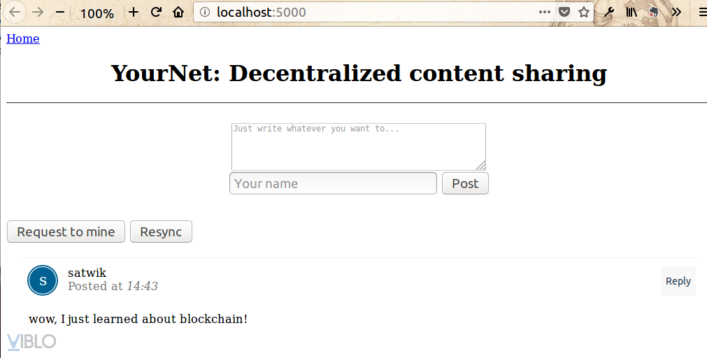 Bạn có thể chạy ứng dụng ( python run_app.py) và tạo transaction(đăng bài qua giao diện web) và khi bạn mined các transaction, tất cả các node trong mạng sẽ cập nhật chain. Và các node cũng có thể được kiểm tra bằng cách gọi bằng cURL hoặc Postman.