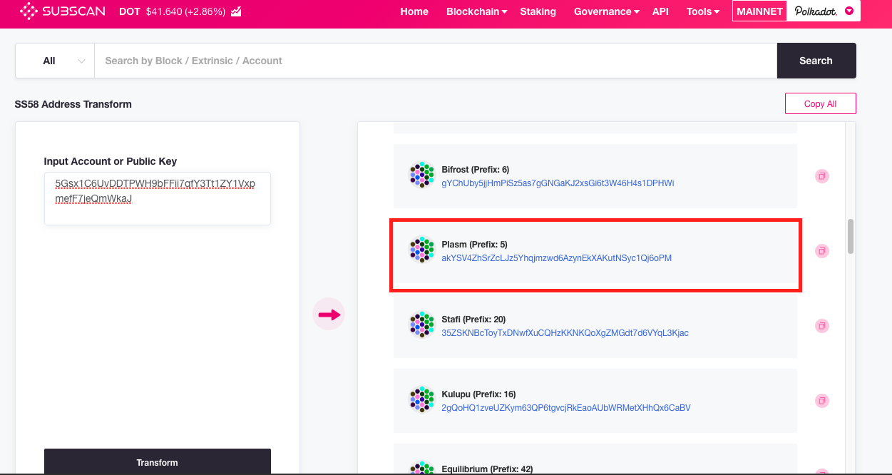 Sau khi lấy được địa chỉ convert sang dạng prefix 5 thì sẽ chuyển sang đây để có thể lấy được đúng địa chỉ trên Plasm tương ứng với địa chi bên Metamask: https://polkadot.subscan.io/tools/ss58_transform