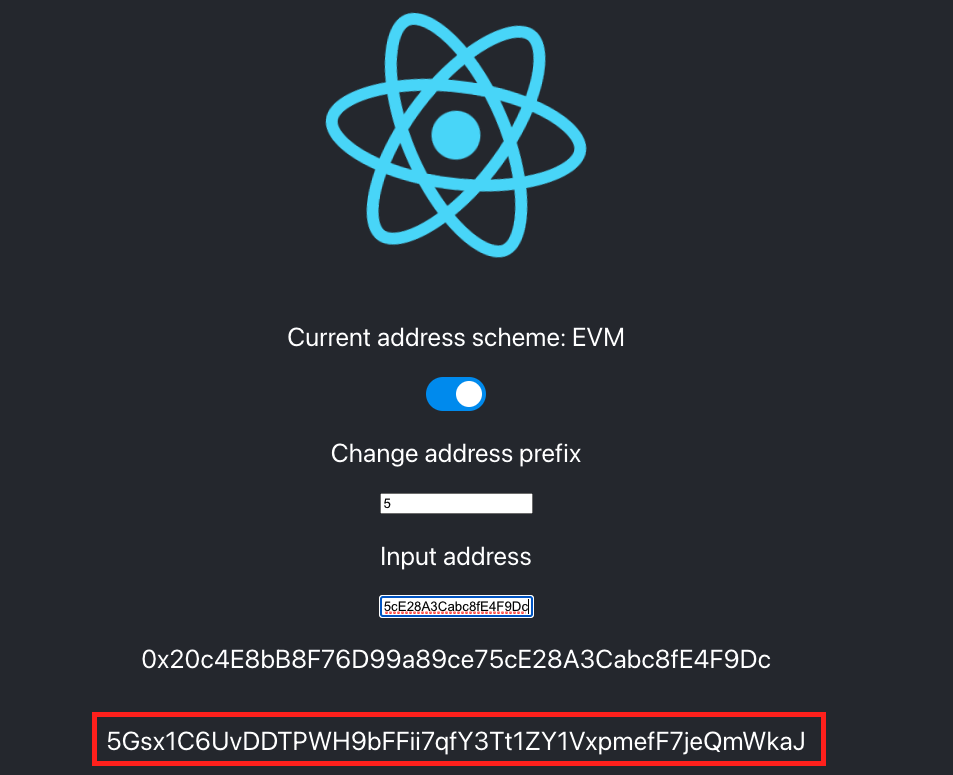 Đầu tiên là convert từ địa chỉ ETH sang dạng prefix 5 thông qua : https://hoonsubin.github.io/evm-substrate-address-converter/index.html