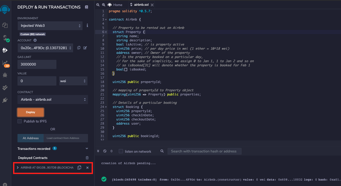 Việc còn lại của chúng ta đó chính là compile và connect mạng Dusty qua metamask và deploy, contract sau khi deploy thành công sẽ xuất hiện :