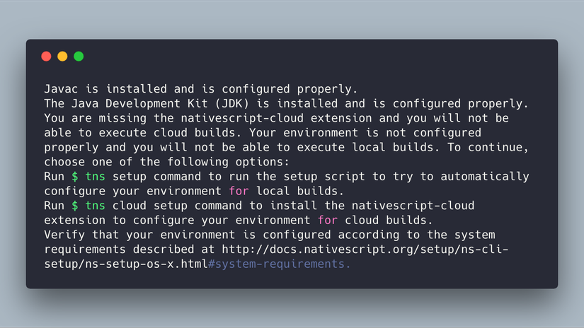 Nếu những thiết lập của bạn như của tôi, bạn sẽ nhận được thông báo sau vì NativeScript chưa được thiết lập hoàn toàn: