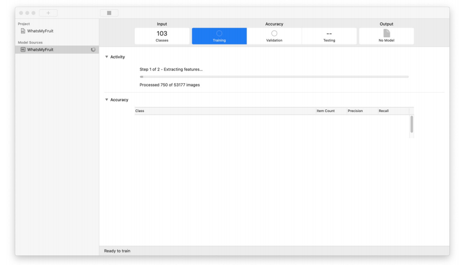 Trong thanh top bar của ứng dụng chọn Play chúng sẽ mất khá nhiều thời gian hãy nhâm nhi 1 tách cà phê hẳn sẽ rất tuyệt vời đấy . CreatML sẽ bắt đầu đào tạo mô hình cho bạn!