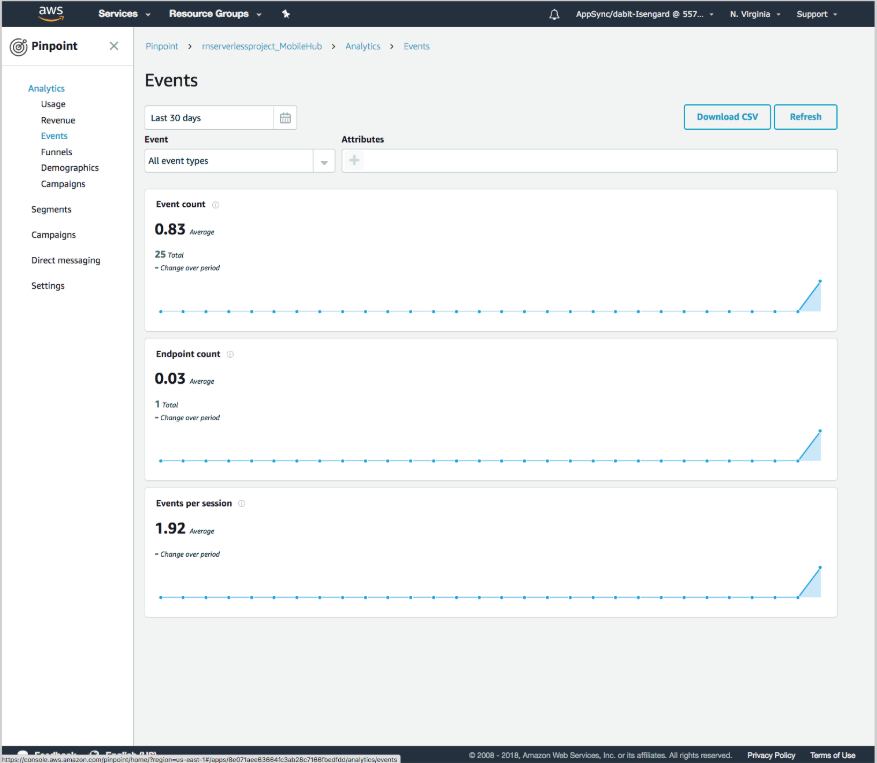 Để xem dữ liệu analytic, chúng ta có thể vào trong AWS Mobile Hub project trong console, thực hiện bằng cách ấn vào Resources ở góc trên bên phải và chọn vào Pinpoint và ấn vào dịch vụ của bạn.