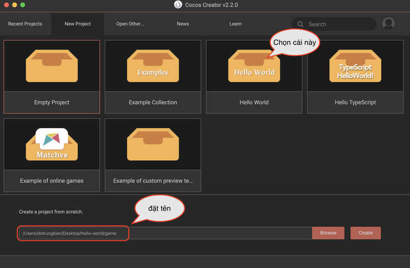 Ta sẽ khởi động Cocos Creator lên và tạo một project mới, để project đơn giản và dễ hiểu nhất ta sẽ tạo project theo template Hello-world