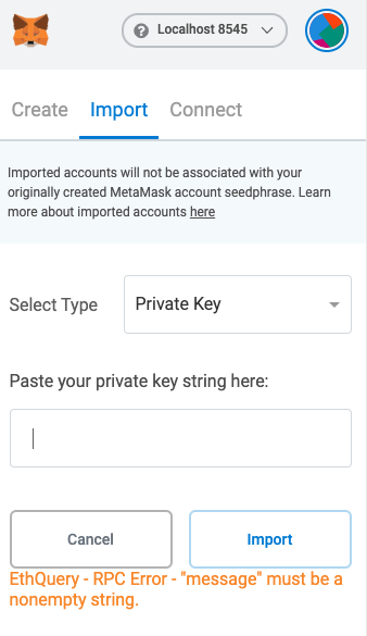Sau đó ta sẽ nhập vào private key đầu tiên ở bên trên khi ta chạy ganache-cli lúc nãy