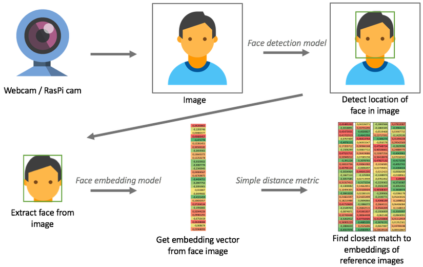 Sau khi crop được face từ bước detect, căn chỉnh lại face từ bước alignment, việc tiếp theo chúng ta cần làm là biểu diễn các face này thành các vector đặc trưng trước khi đưa vào mô hình dự đoán indentity. Có thể hiểu đơn giản thế này, để việc recognize đạt được độ chính xác cao chúng ta cần xây dựng được một bộ dataset có tính decriminitive nghĩa là có tính phân biệt giữa các thành phần. Ví dụ: các thành phần biễu diễu Person A với các thành phần biễu diễn Person B nên có sự khác biệt và các thành phần biễu diễn của Person A nên có tính tương đồng với nhau. Để làm được điều này chúng ta cần có một mô hình trích xuất ra các thuộc tính đặc trưng nhất của ảnh, chúng ta có thể tự định nghĩa một model của riêng mình hoặc sử dụng sẵn các pretrained models như faceNet, ArcFace, VggFace,... để trích xuất ra các vector đặc trưng.