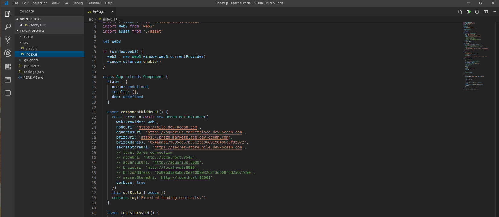 Trong bài này thì mình sẽ không hướng dẫn các bạn làm một sản phẩm mà sẽ cùng phân tích source code của một sản phẩm demo được cung cấp bởi Ocean Protocol Foundation. Ở github của Ocean ngoài những Open source của họ về các module Aquarius, Barge hay Squidjs thì các bạn sẽ thấy có 2 repo là react-tutorial và commons . Đây là 2 source mà mình nghĩ phù hợp nhất để bắt đầu vọc vạch về Ocean Protocol. Trong bài viết lần này mình sẽ cùng các bạn phân tích với source react-tutorial