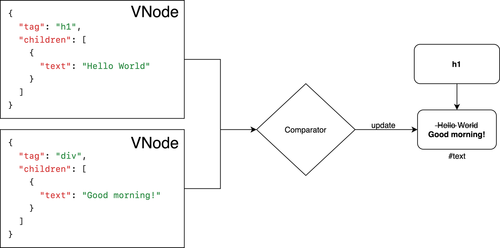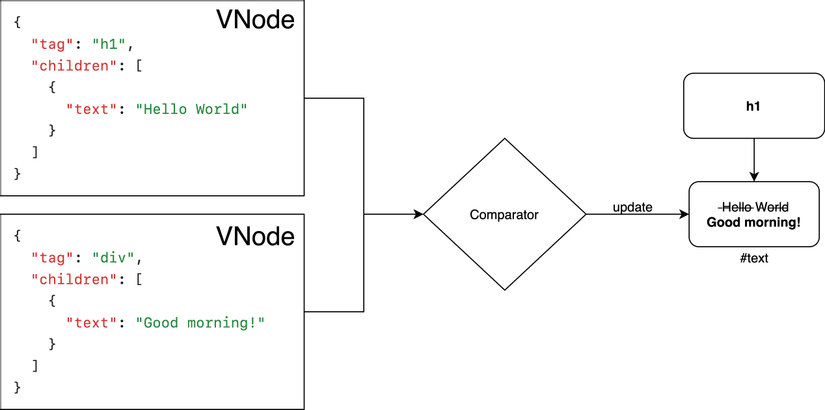 Thế VNode cập nhật thì sao nhỉ? Chúng ta sẽ so sánh để tìm xem element nào là khác biệt thì tiến hành cập nhật lại DOM tương ứng với phần tử đó.