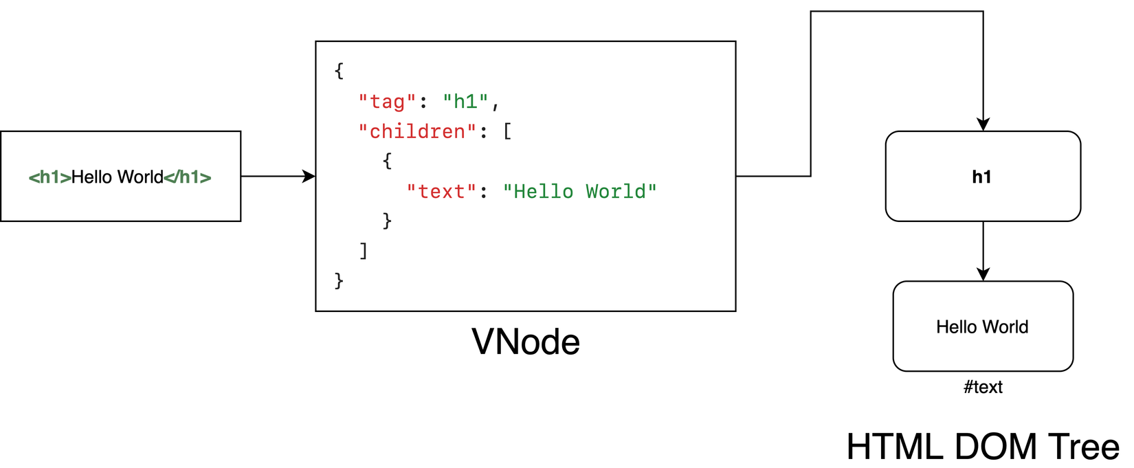 Bên dưới là ảnh mô tả quy trình chuyển từ template sang VNode, tiếp đó đưa lên trình duyệt là một HTML DOM Tree.
