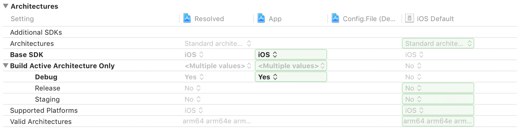 ONLY_ACTIVE_ARCH[config=Debug][sdk=*][arch=*] = YES
