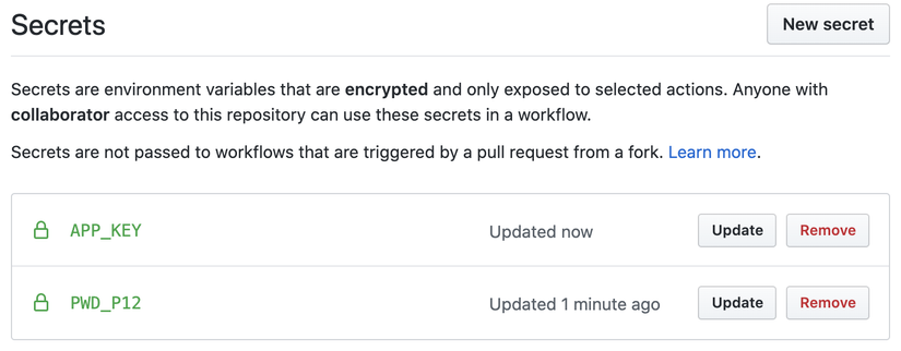 Sau khi đã truy cập vào Settings -> Secrets. Chúng ta sẽ thực hiện khởi tạo KEY để sử dụng lưu trữ vào bảo mật apiKey, password để mở file p12.