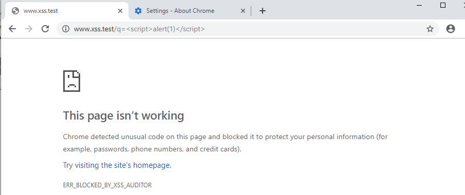 - Tuy nhiên, nó sẽ không chặn những yêu cầu này ngay lập tức. Thay vào đó, nó sẽ chờ phản hồi từ máy chủ để kiểm tra xem những đầu vào nguy hiểm này có thực sự được reflected trên page mà không có bất kì kiểm duyệt nào không. Chỉ trong trường hợp đó, XSS Auditor mới có hành động: ngăn toàn bộ quá trình loading của trang web hoặc xóa các đoạn script được chèn.