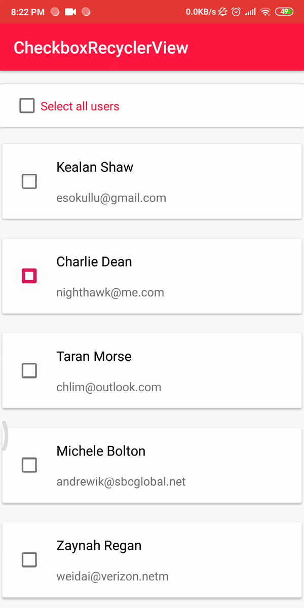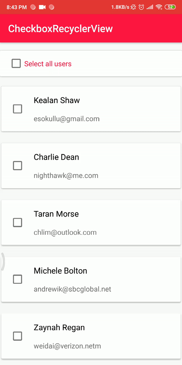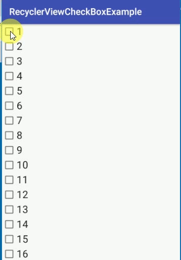 Ở bài viết này, chúng ta sẽ xử lý trạng thái của checkbox trong RecyclerView. Như hình ảnh gif ở trên, khi chúng ta scroll recyclerview thì các checkbox của các Viewholder sẽ bị reset state và unchecked. Chúng ta sẽ tìm hiểu hướng giải quyết qua ví dụ sau.
