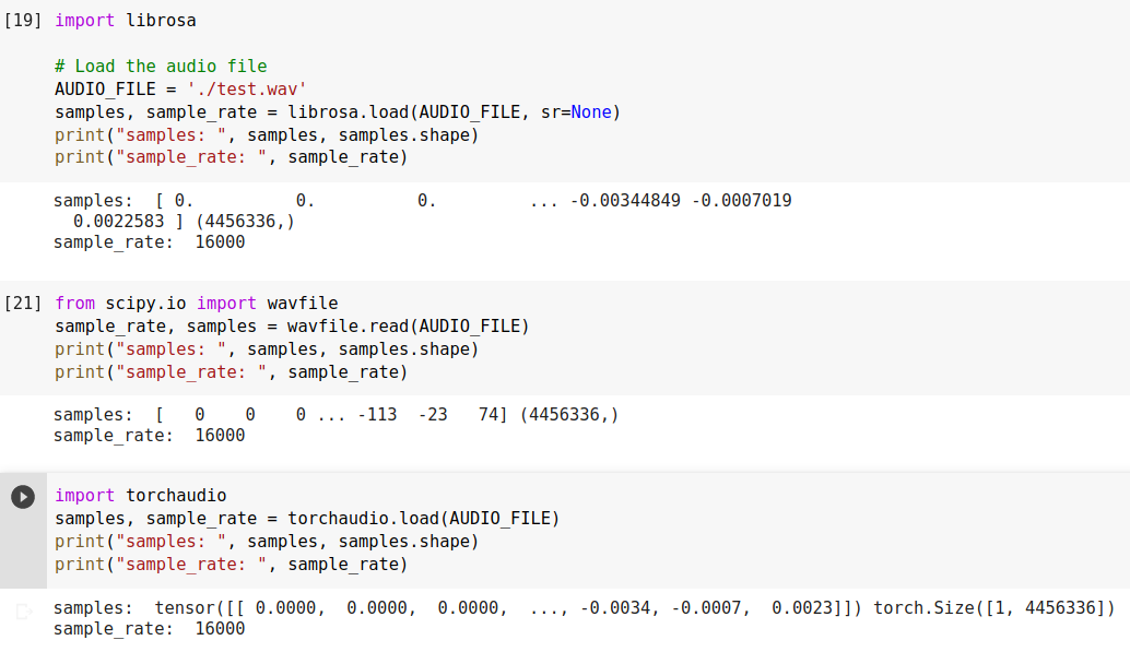 Một số thư viện python hỗ trợ xử lý âm thanh như librosa, scipy, torchaudio. Tất cả đều cho phép bạn đọc các tệp âm thanh ở các định dạng khác nhau.