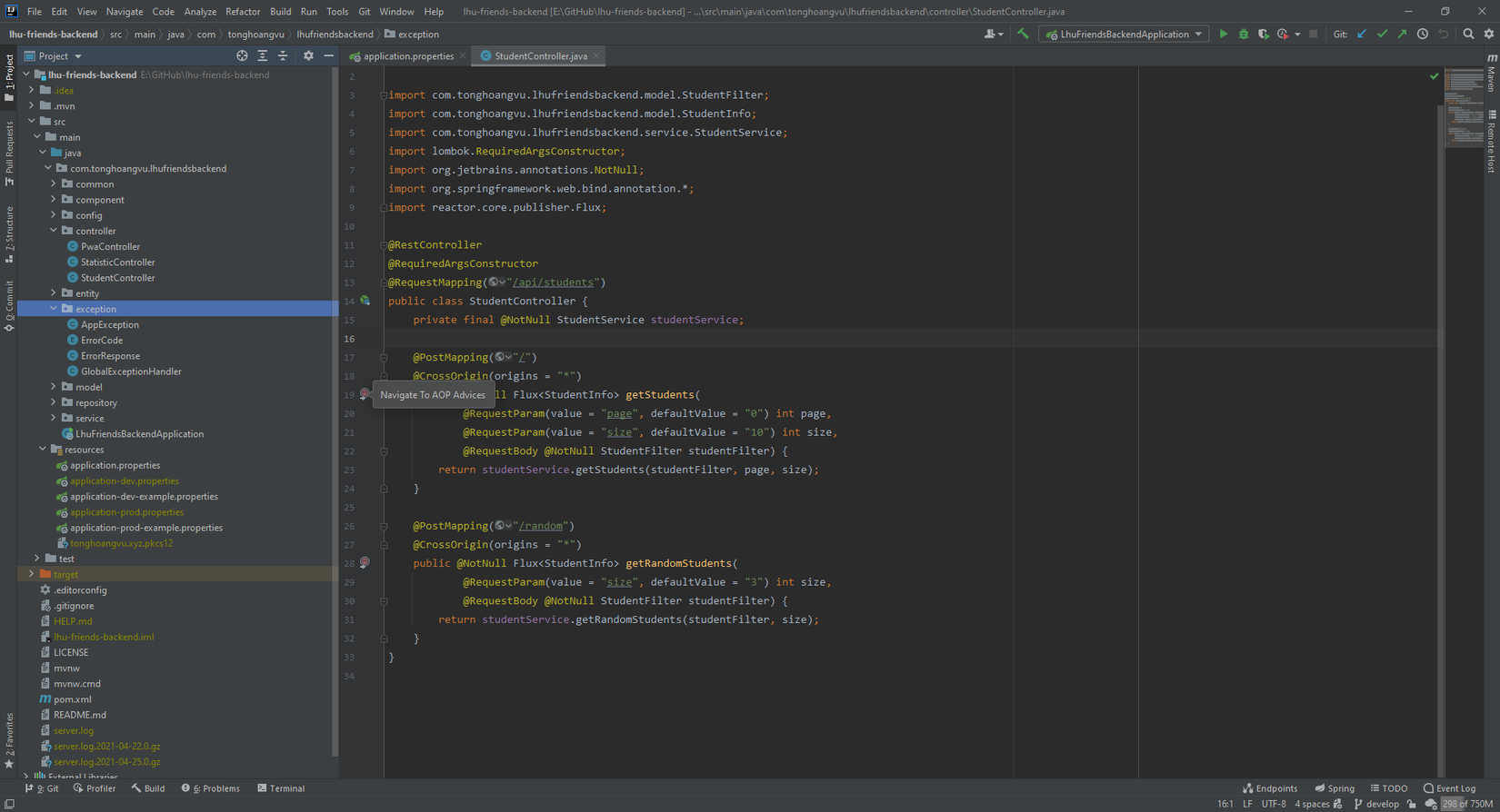 Như trong hình, các bạn để ý icon @ màu hồng ở lề trái. Đó là dấu hiệu có một aspect sẽ chèn vào ngay vị trí đó (trong hình là aspect dùng để logging lại các API controller được gọi).