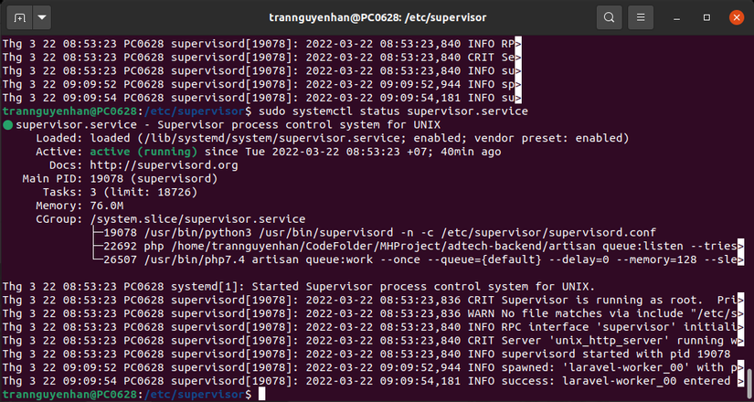 Sau khi cấu hình xong, chúng ta sẽ chạy lại 2 lệnh sau để supervisor đọc lại tệp cấu hình và áp dụng thay đổi: