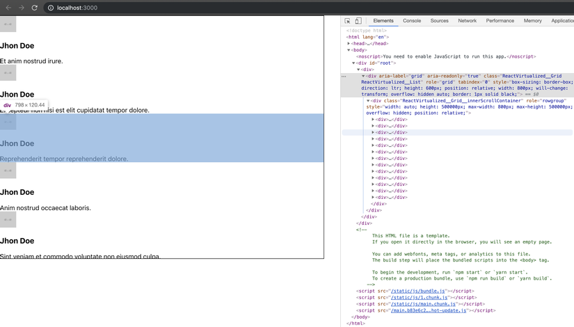- ReactVirtualizedGridinnerScrollContainer có max-width 800px nhưng height là 500000px, đây là kết quả của 10000 phần tử của mảng và 50px mỗi row. Nó không hiển thị 10000 phần tử mà chỉ từ 14-17 phần tử. Lý do của sự thay đổi này là do List render thêm các element để khi ta scroll sẽ cảm thấy smooth hơn trong khi vẫn chỉ hiển thị tối da 17 phần tử trong đó, awesome phải không, và đặc biệt sẽ rất tiết kiệm performance khi bạn phải render danh sách lớn.