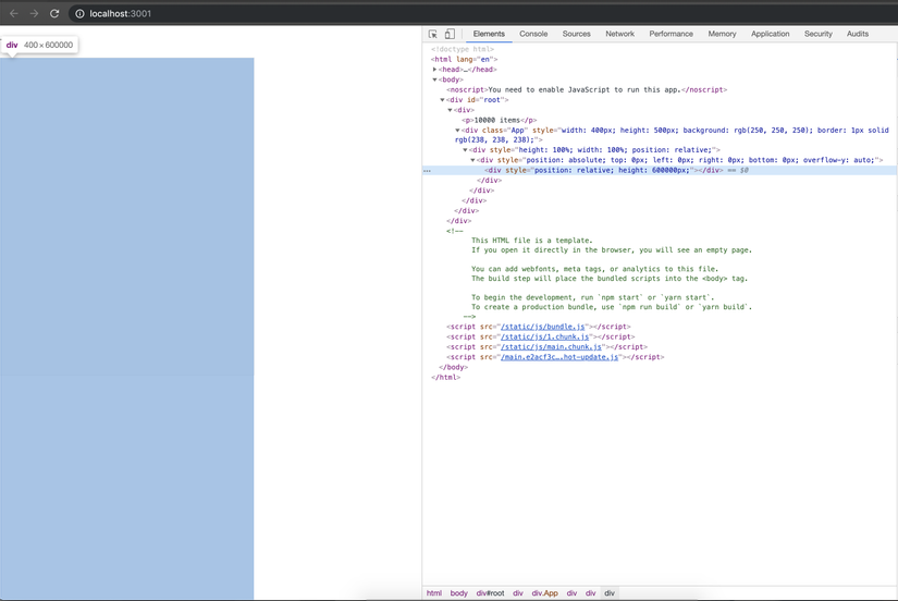 Oki, vậy là ta đã lấy được height của khung view, giờ là việc lấy height của tất cả 10.000 phần tử, ta chỉ việc lấy số lượng data * với rowHeight mà ta đã truyền vào List component dưới dạng props: