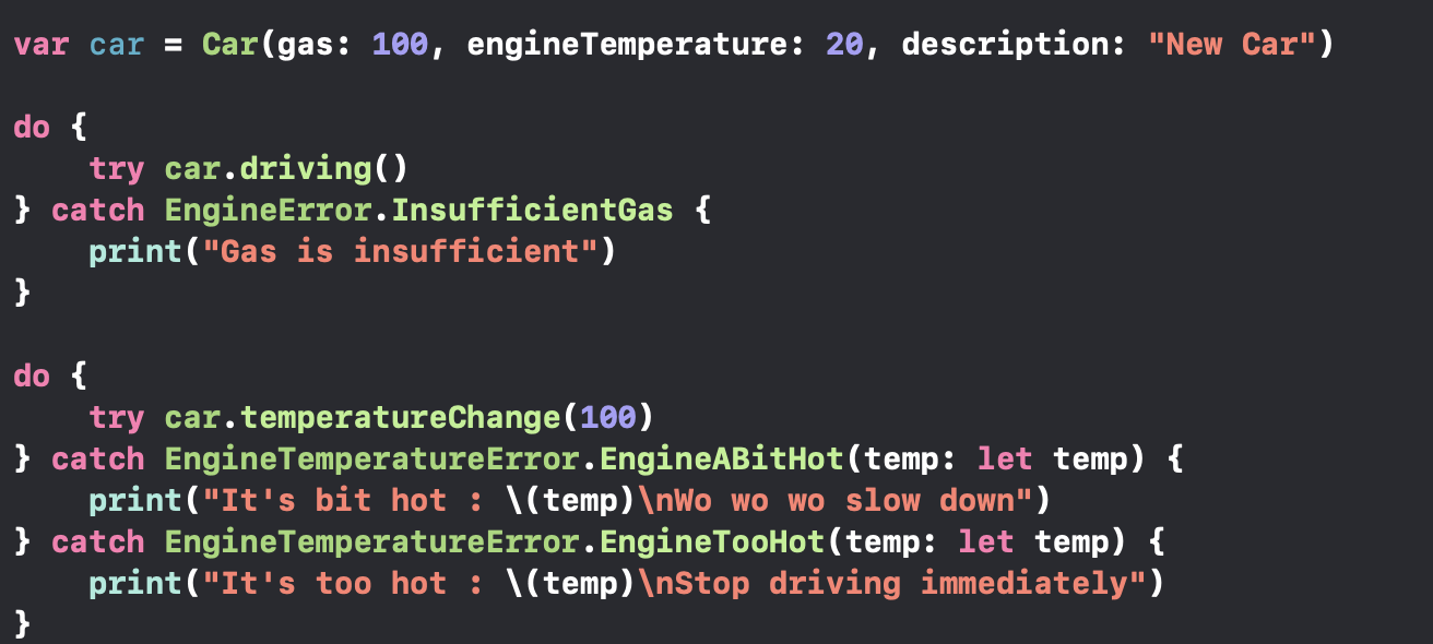 Vì chúng ta sẽ "ném" về lỗi nên sẽ không cần phải trả về bất kì giá trị nào từ driving() và temperatureChange(_: Double):