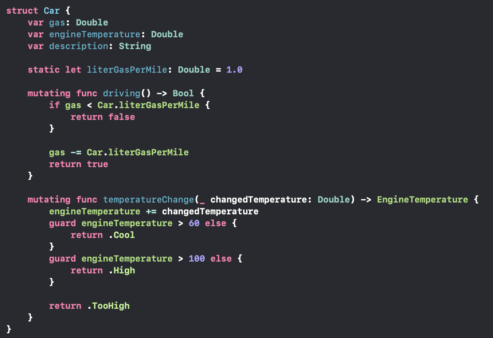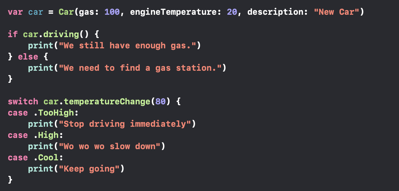 Chúng ta có một cái xe và chúng ta cần phải quyết định chiếc xe đó có đủ xăng hay ko hay động cơ có bị quá nóng. Và để xác định được các trường hợp trên thì ta có các hàm như sau: driving() và temperatureChanged(:Double).