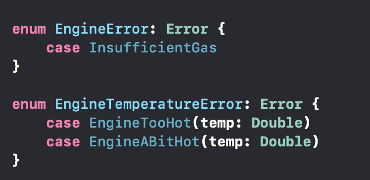 Đầu tiên, chúng ta cần xác định 2 enums gọi là EnginEror và EngineTemperatureError với Error Protocol: