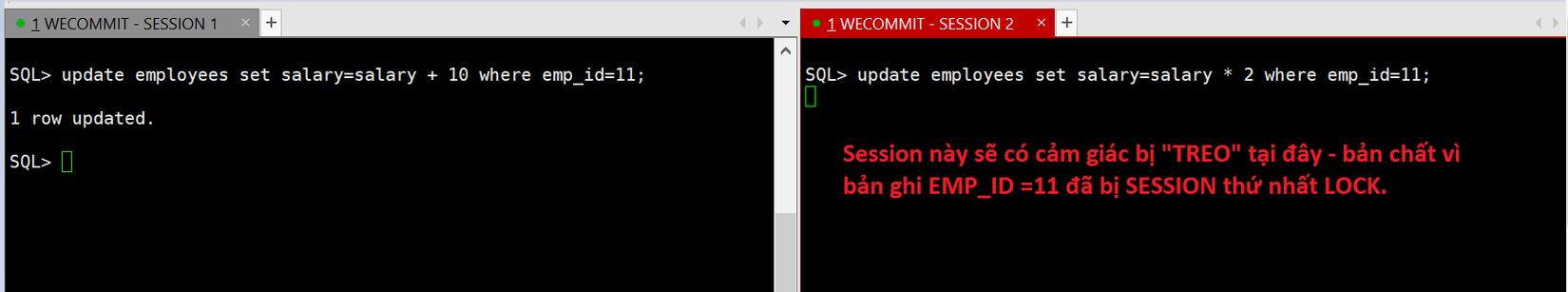 - Session thứ hai sẽ có cảm giác bị “TREO”, bản chất việc “TREO” này là do bản ghi EMP_ID=11 đang bị “KHÓA” bởi Session thứ nhất.