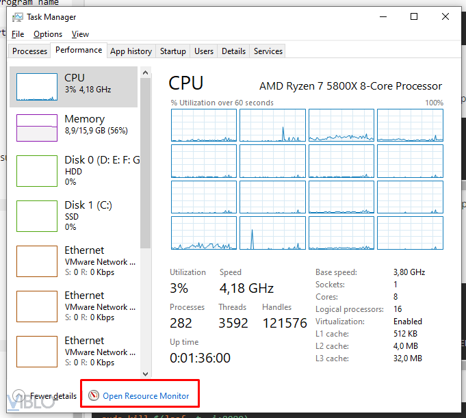 Mở giao diện Resource Monitor bằng cách chọn tab Performance và chọn nó