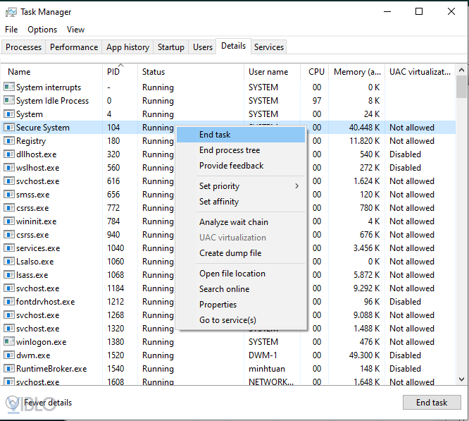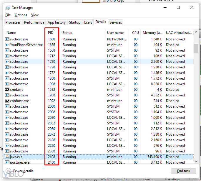 Xác định được PID nào bạn muốn kill thì chuột phải chọn End task là xong