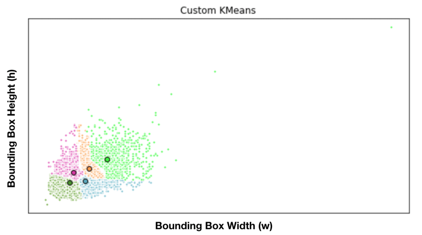 Bằng việc dùng Kmean để phân cụm, ta sẽ tính ra được B anchor box đại diện cho các kích thước phổ biến. Dưới đây là minh họa cho cách tính các anchor box đại diện trong 1 bộ dataset.