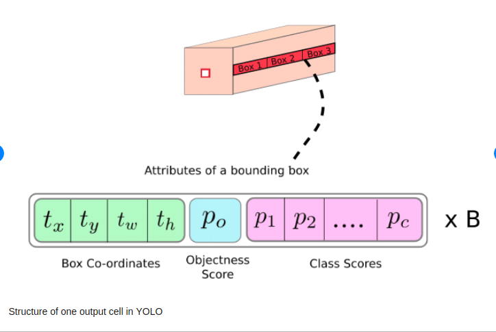 - Trong đó, B là số bound box, mỗi bound box gồm 5 số liệu: (x,y,w,h, confidence_score). confidence score xác suất tại ô đó có object hay không. Cuối cùng là C phần tử - đại diện cho phân bố xác suất về loại object, tức class distribution. Vì C phần tử này là một phân phối xác suất nên cần đảm bảo: