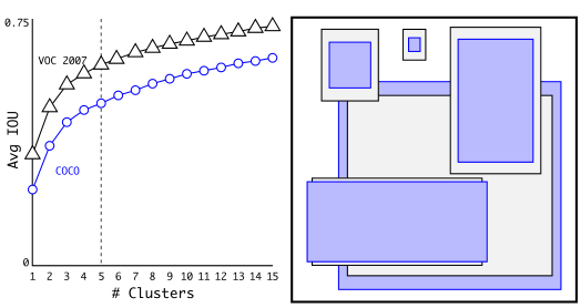 Hình trên là phân cụm anchor box trên các tập dữ liệu VOC và COCO. Hình bên trái biểu diễn giá trị trung bình với các giá trị khác nhau. Giá tri được chọn vì có mức độ tradeoff tốt giữa high recall vs model complexity. Hình bên phải biểu diễn các tâm cụm của hai tập dữ liệu VOC và COCO. Ta thấy COCO có độ biến động kích thước lớn hơn so với VOC. Sau khi thực hiện K-Means, các tâm cụm (là các kích thước anchor box) có khác biệt đáng kể so với anchor boxes được chọn bằng tay.