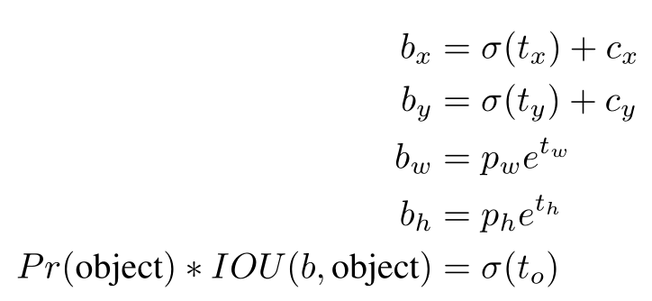 YOLOv2 dự đoán 5 bounding box mỗi ô trong feature map. Network sẽ dự đoán 5 tọa độ cho mỗi bounding box: . Nếu ô đó có tọa độ (với tâm tính từ góc bên cùng bên trái của bức ảnh) và anchor box có chiều rộng và chiều cao là thì dự đoán của bounding box sẽ có công thức sau: