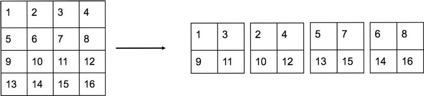 Hình trên là một feature map kích thước . Để đưa feature map về kích thước , tức là giảm chiều rộng đi lần và chiều dài đi lần, ta tách feature map thành ma trận như hình bên trái ở trên, ứng với channel của feature map mới, với cơ chế sắp xếp lại vị trí các phần tử như sau: vị trí của các giá trị trong mỗi channel của feature map mới sẽ lấy cách đều trên feature map ban đầu với stride = 2 theo cả chiều dài và chiều rộng.