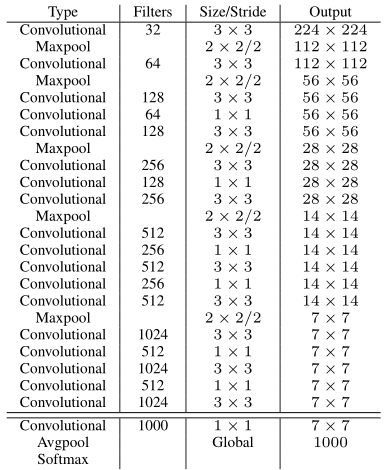 Thay vì sử dụng custom network dựa trên kiến trúc GoogLeNet, YOLOv2 sử dụng một classification model mới để làm base network, có tên là Darknet-19. Nó bao gồm 19 Convolutional Layers và 5 Maxpooling Layers. Hình dưới đây mô tả kiến trúc cụ thể của Darknet-19.
