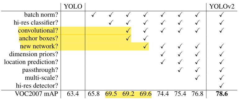 Vì thế, YOLOv2 tập trung chủ yếu vào việc cải thiện recall và localization trong khi vẫn duy trì được classification accuracy, qua đó cải thiện độ chính xác của mô hình. Những sự thay đổi đó bao gồm việc tận dụng lại các công trình làm việc trước đó, đồng thời cũng sáng tạo ra những ý tưởng mới, và được liệt kê dưới đây: