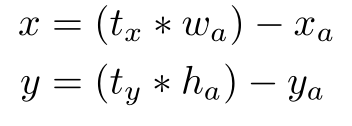 Dự đoán trực tiếp tọa độ tâm của bounding box: Đây là vấn đề thứ hai ta gặp phải khi sử dụng anchor box, đặc biệt là ở các vòng lặp đầu tiên. Tính bất ổn đó chủ yếu đến từ việc dự đoán tọa độ tâm của các bounding box. Nhắc lại rằng trong mạng Region Proposal Network (RPN) của Faster R-CNN, nó sẽ dự đoán hai giá trị là độ dịch chuyển của bounding box theo hai chiều rộng và chiều cao của anchor box. Khi đó, tọa độ tâm của bounding box được tính như sau: