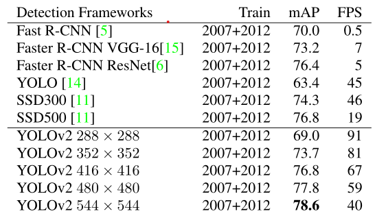 Bảng trên so sánh các hệ thống detection trên tập dữ liệu test PASCAL VOC 2007. Ta có thể thấy YOLOv2 vừa nhanh hơn và chính xác hơn các hệ thống detection đời trước. YOLOv2 sẽ chạy nhanh hơn với các bức ảnh có kích thước nhỏ. Ở độ phân giải cao nhất, YOLOv2 đạt được độ chính xác lớn nhất với 78.6 mAP trong khi vẫn đạt được tốc độ lớn hơn thời gian thực (40 FPS). Hơn nữa, nó có thể chạy tại các độ phân giải khác nhau mà không đánh đổi quá nhiều giữa speed và accuracy.