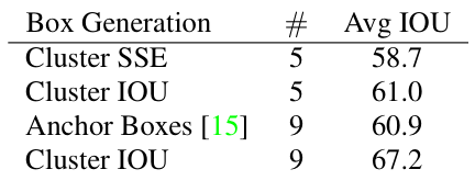 Bảng trên so sánh average IOU với anchor box gần nhất trên tập dữ liệu VOC 2007, thu được từ thuật toán K-Means Clustering ở trên và chọn anchor boxes bằng tay. Chỉ với anchor box, Cluster IOU (hàng thứ 2) đã cho kết quả ngang hàng với Anchor Boxes (hàng thứ 3) với 9 anchor boxes. ( so với ). Khi thì Cluster IOU cho giá trị average IOU cao hơn hẳn so với Anchor Boxes với . Điều này cho thấy việc sử dụng thuật toán K-Means Clustering sẽ giúp cho việc khởi tạo mô hình dễ dàng hơn và các công việc xử lý sau đó được đơn giản hơn.