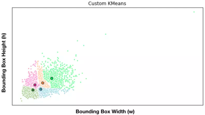 Hình trên là minh họa thuật toán K-Means Clustering trong việc dự đoán các anchor box ở trên, với . Mỗi cụm là một màu khác nhau, tương ứng với màu của tâm (là kích thước của anchor box).