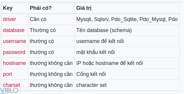 - $configArray là mảng cấu hình thông số với các key/giá trị có thể có như sau:
