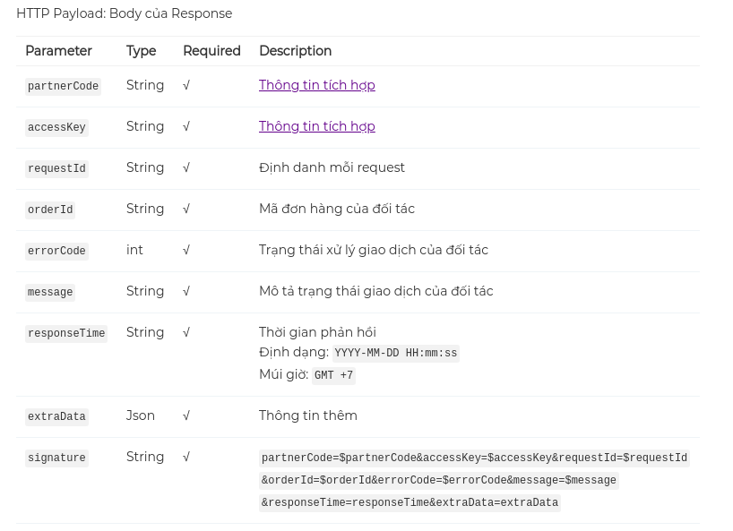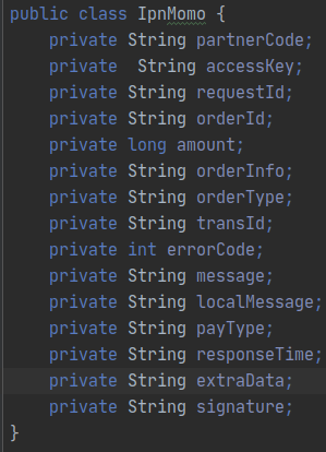 Mình đã thử tạo ra 1 object để có các trường giống như response Momo trả về nhưng vẫn chưa được.