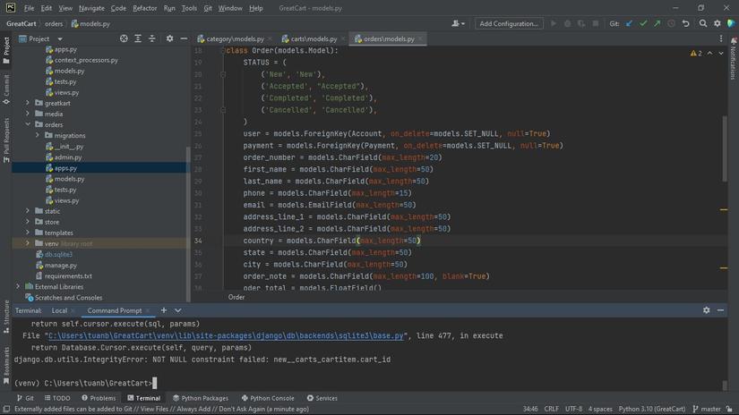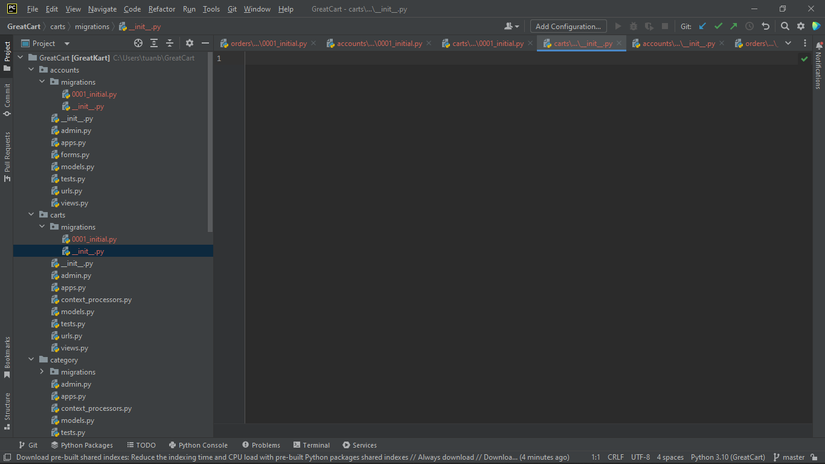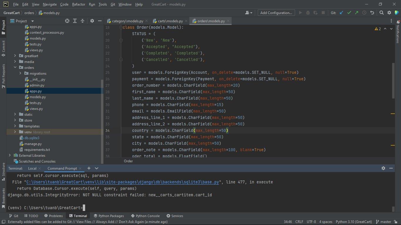 Em chào mọi người, sau khi em tạo thêm app "orders" thì xảy ra lỗi như trong hình, em sửa mãi không được nên em đã xóa cái database từ đầu và các migrations của các app. Thì bây giờ các migrations này nó đỏ lòm hết dù đã sủa được lỗi.