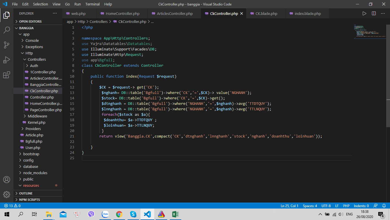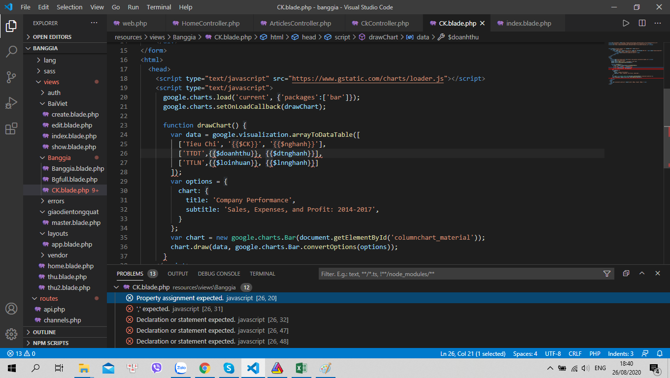 Mình có học làm 1 web đơn giản, hiện tại mình đang muốn tạo chart bằng Google Chart, mình có tạo 1 form rồi điền Mã CK vào, từ form này mình dùng $CK = $request-> get('CK'); để lấy được MÃ CK xem người dùng muốn xem là gì, từ đó tính toán trung bình doanh thu và trung bình lợi nhuận theo nghành. code ở Controller mình làm nếu có thể tối ưu nhờ các bạn chỉ giúp, với code trên mình in dữ liệu vào html của google chart thì VScode báo lỗi tùm lum Property assignment expected và Declaration or statement expected. Nhưng biểu đồ vẫn chạy được. Xin hỏi lỗi này là gì. Cảm ơn các bạn đã giúp đỡ