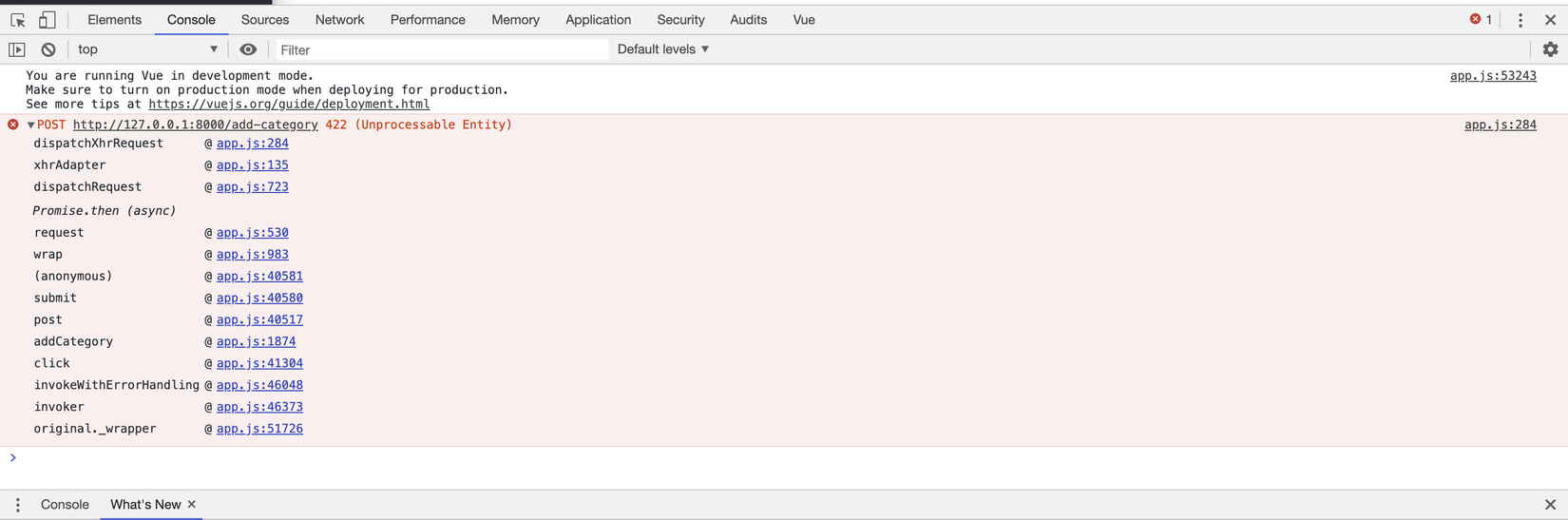 1. Cái request tới backend đang bị lỗi với status code 422, có thể là bạn đang dùng Laravel và request chưa qua được Request Validation. Do request lỗi nên code sẽ chạy vào trong .catch. Cái catch ko làm gì cả nên bị exception bị "ngậm" luôn đi chứ không phải không có lỗi báo ra như bạn đề cập.