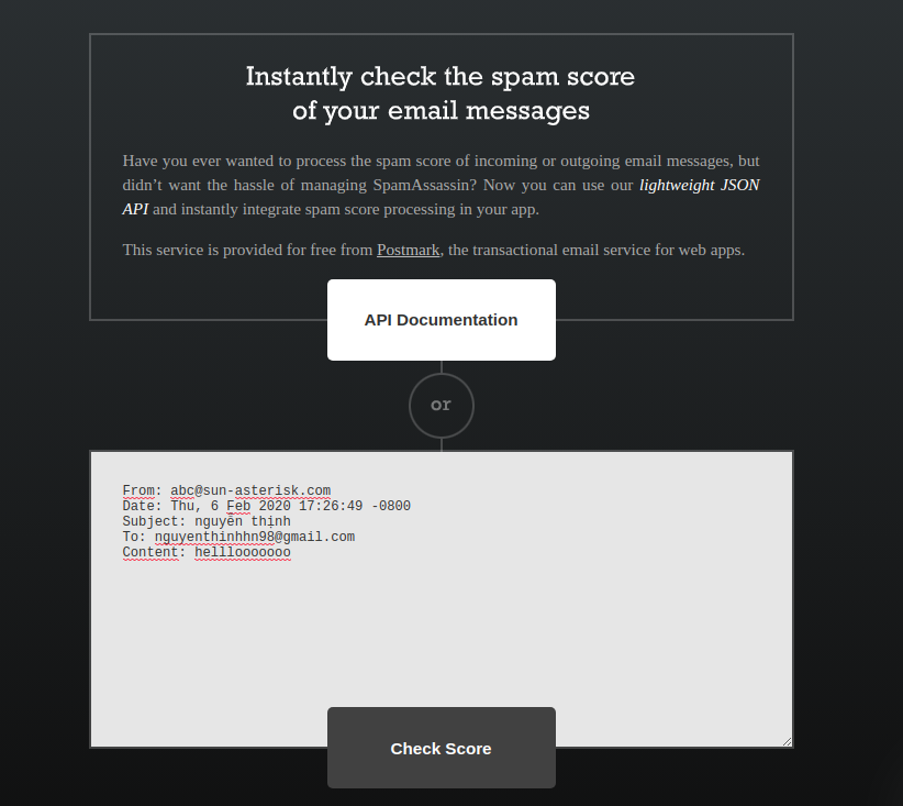 Hello mọi người. Hiện này em đang làm chấm điểm nội dung email xem nó là spam hay không spam , em có thử dùng API của trang https://spamcheck.postmarkapp.com/ nhưng nó đang chấm điểm theo các thông tin khác như From,Subject,To còn khi em thay đổi content thì điểm không thay đổi gì, cái em cần là chấm điểm nội dung email. Ai đã sử dụng trang này hay có giải pháp khác không ạ . Em cảm ơn.